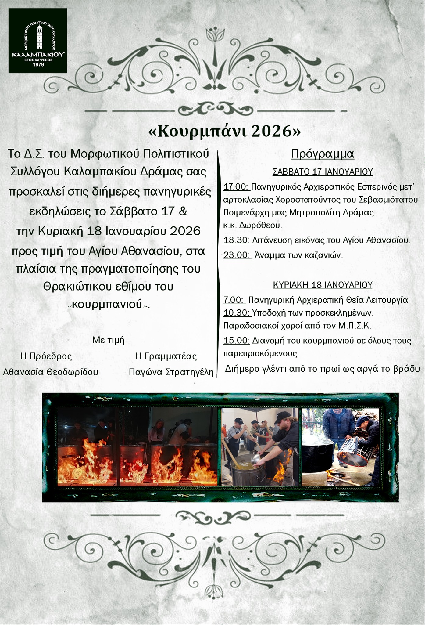 «Κουρμπάνι 2026» Το Δ.Σ. του Μορφωτικού ΠολιτιστικούΣυλλόγου Καλαμπακίου Δράμας σαςπροσκαλεί στις διήμερες πανηγυρικέςεκδηλώσεις το Σάββατο 17 &την Κυριακή 18 Ιανουαρίου 2026προς τιμή